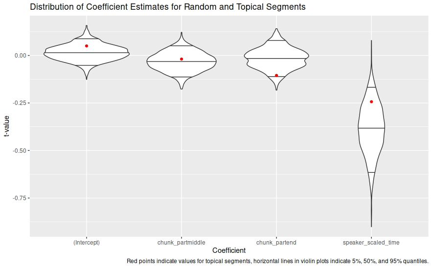 class: top, title-slide .title[ # The overlooked effect of amplitude on within-speaker vowel variation ] .author[ ### Joshua Wilson Black, Jen Hay, Lynn Clark, James Brand ] .date[ ### 11 July 2022 ] --- # The Team This research was carried out by **Joshua Wilson Black**, **Jen Hay**, **Lynn Clark**, and **James Brand**. This work is part of the project _Towards an Improved Theory of Language Change_, based at the New Zealand Institute of Language, Brain and Behaviour | Te Kāhui Roro Reo at the University of Canterbury | Te Whare Wānanga o Waitaha. We gratefully acknowledge the support of the Marsden Fund | Te Pūtea Rangahau a Marsden. .left[] _Application number: (17-UOC-049)_ ??? Contributions: Joshua Wilson Black: primary analysis, write up. Jen Hay: research direction, write up. Lynn Clark: research direction. James Brand: pilot work on interval representation of data. --- # Overview Our **problem**: Research on style _predicts_ systematic covariation of linguistic variables as a result of shifts in speaker style (e.g. Podesva 2008), and _invites_ the development of quantitative methods to explore any such covariation (e.g. Tamminga 2021). Our **method**: To extend Brand et al.'s [(2021)](https://www.sciencedirect.com/science/article/pii/S0095447021000711#ak005) use of PCA from _across_-speaker variation to _within_-speaker variation. Our **results**: 1. Relative amplitude has a significant and under-appreciated impact on speaker vowel spaces. - Revealed by covariation in first formant values. - Known in experimental environments with introduction of loud background noise, not known for naturalistic recordings in a quiet environment. 2. Amplitude is used, potentially agentively, to mark position within topical subsections of monologues. ??? The literature on style both _predicts_ covariation of linguistic variables and _invites_ methodological developments so that we can get a quantitative handle on such covariation. Evaluating the predictions depends on the development of appropriate methods. Previous work on the project (by all authors but Wilson Black), showed that Principal Component Analysis is an appropriate methods for finding vowel covariation across speakers. We attempt to push a similar method in order to explore within-speaker covariation. We did not find stylistic covariation. However, we did find a surprising and, we argue, overlooked, source of covariation in amplitude. We find that first formant values pattern together with amplitude. While this is known in certain laboratory environments, and is particularly associated with loud speech and/or distant interlocutors, it has not been shown in the kind of naturalistic recordings which sociolinguists are often interested in. Second, we found that variation in amplitude is being used, possibly on purpose, by speakers to mark their position in sub-topic segments of our recordings. This is a potential link with literature on, say, turn-taking, where amplitude is a variable which can be used to signal that one is finished or not in a dialogue. We didn't solve our problem, but our results are of interest nonetheless! We will discuss the first of these results here, but are happy to talk about the second if that is of interest. --- # Our Data: Quakebox .pull-left[  <figcaption>Source: Waynne Williams (Port Hills Productions)</figcaption> ] .pull-right[ - 431 single-speaker monologues - Prompt: "tell us your earthquake story". - 277 speakers with topic tagging. - Stored as LaBB-CAT instance, with forced alignment via HTK. - Extract using LaBB-CAT interface to Praat: - F1 and F2 for all monophthongs at midpoint of _token_, - Maximum amplitude of _word_ in which monophthong token appears, - Articulation rate of _utterance_ in which monophthong token appears. ] ??? Our data comes from the QuakeBox corpus (Clark et al., 2016). The corpus has 431 speakers who freely respond to the prompt 'tell us your earthquake story'. The recordings are made with high quality audio and video equipment. The corpus contains topic tagging for a subset of speakers. These tags indicate whether the speaker is talking about, say, the September 2010 Earthquake, or the larger February 2011 Earthquake, or their life before the earthquakes etc. The corpus is stored in LaBB-CAT and run through HTK forced alignment (Fromont and Hay, 2008). LaBB-CAT also interfaces with Praat. If it comes up **filtering details** are given as an additional slide at the end of the deck. --- # PCA Analysis .pull-left[  <figcaption>Data from Brand et al. (2021)</figcaption> ] .pull-right[ - Principal Component Analysis (PCA) finds structural relationships (PCs) between variables. - PCs are _new variables_ which more compactly represent the original data. - e.g. PC1 and PC2 in plot above capture relationships between the named variables. - PCs can reveal systemic patterns in sound change - Plot on left is a _variable plot_. - Axes are PCs, arrows are original variables. - e.g. PC1: <span style="font-variant: small-caps;">strut</span> and <span style="font-variant: small-caps;">fleece</span> go one way, <span style="font-variant: small-caps;">thought</span> goes the other. ] ??? The example is a simplified version of two PCs in Brand et al. 2021. These are from the ONZE corpus and represent structure in large scale across-speaker change in NZE. Can the same methods work _within_ speakers? --- # Within-Speaker PCA: Intervals .pull-left[  <figcaption>Data from two monophthongs against 240 second intervals.</figcaption> ] .pull-right[ - **Problem:** to move _within_ monologues, we need multiple observations per speaker. - **Simple solution:** divide monologue into intervals and take means. - How long?: - need enough tokens of each monophthong, but - long intervals will miss covariation at shorter time scales. - Two lengths: 60s and 240s. ] ??? The observations need to be _complete_. That is, we need an entry for each of our variables (formants, amplitude, and articulation rate for eac